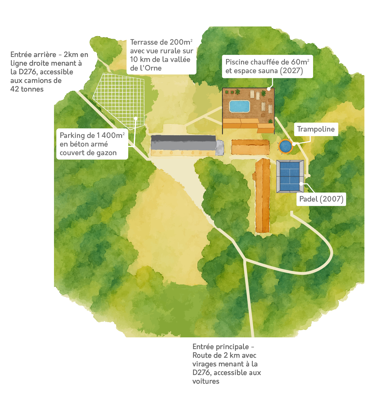 Plan d’étage & Terrains Plan d’étage Plan des Abords Terrains Le domaine de Gevraise dispose d’un peu moins de dix kilomètres de sentiers pédestres sans quitter la propriété.